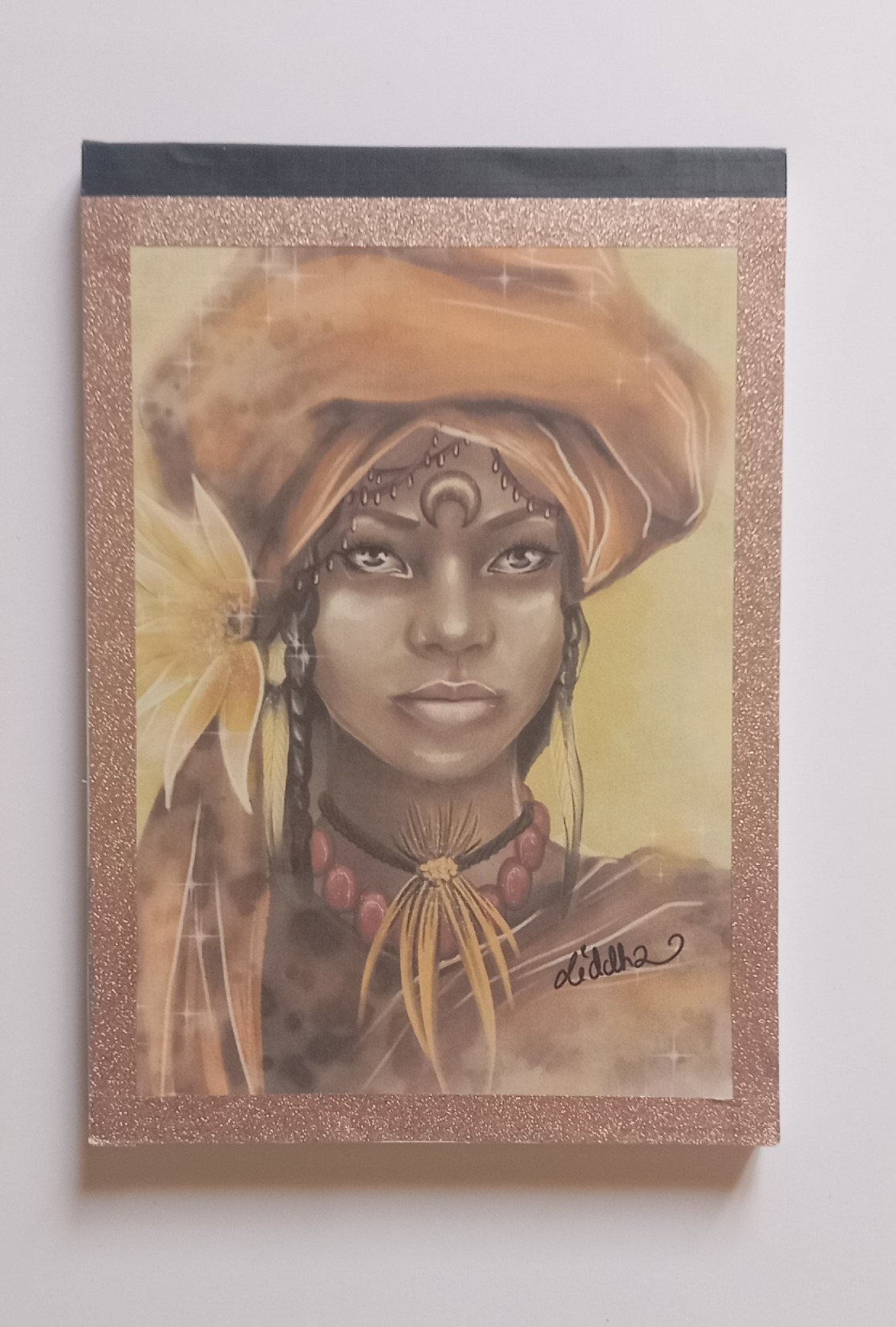 L’illustration a été conçue dans un style graphique personnel, mêlant atmosphère onirique, détails visuels et sensibilité artistique. Imprimée sur la couverture du bloc-notes, elle transforme cet objet du quotidien en un support à la fois pratique et esthétique.